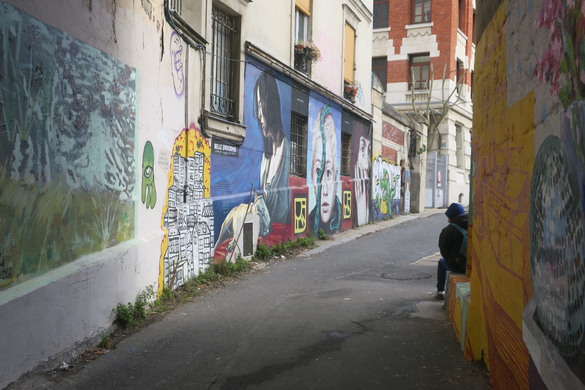 Rentrer en marchant, en discutant, sans arrêter de parler, avec Alice à mes côtés, au rythme de notre avancée, nos mots et nos pas s’enchaînent dans un mouvement qui les associe, les dynamise, et les emballe. Tout va si vite, on ne réfléchit pas au chemin suivi, pas la peine, on rentre chez nous. Le paysage disparaît dans cet élan, les points de vue se confondent, sur le parcours, seules quelques images, parfois seulement quelques fragments, retiennent notre attention : la perspective d’une rue fuyante, les branches des arbres se détachant dans le bleu du ciel, la lumière chatoyante qui fait vibrer la pierre des immeubles, les passants qui nous croisent d’un pas pressé, nous ignorant ou faisant mine de. On parvient tout de même à prendre quelques photos, au passage, on déclenche sur le vif, ou au moment d’attendre son tour pour traverser la rue, au passage piéton. Notre conversation ne s’interrompt à aucun moment, c’est un flux continuel, un dialogue impromptu, enjoué. Et nous voilà déjà arrivés.