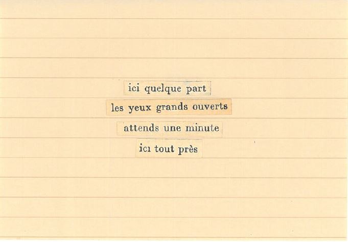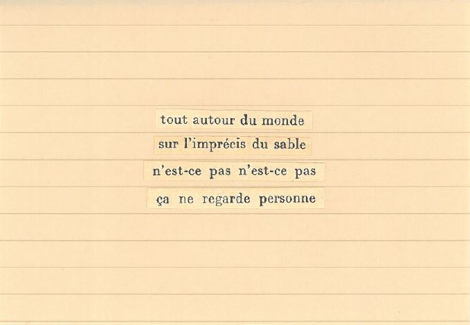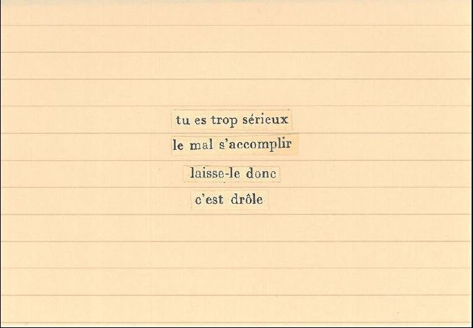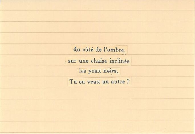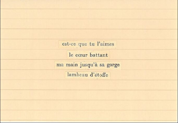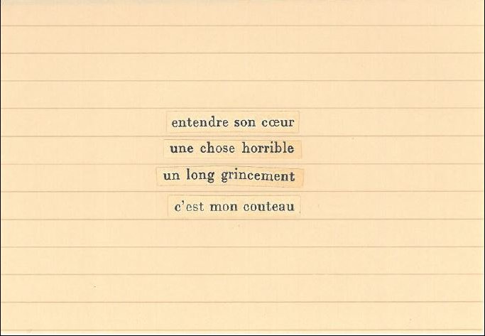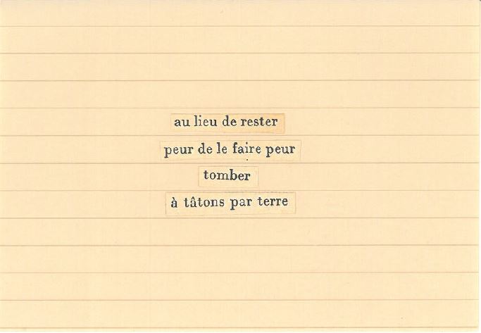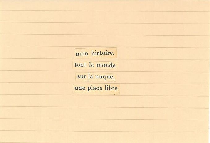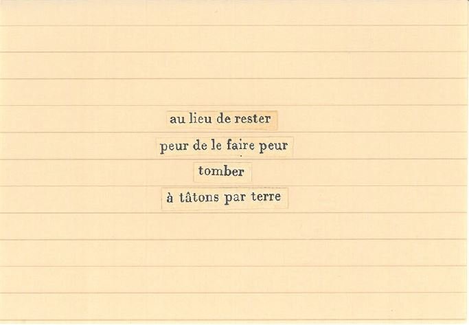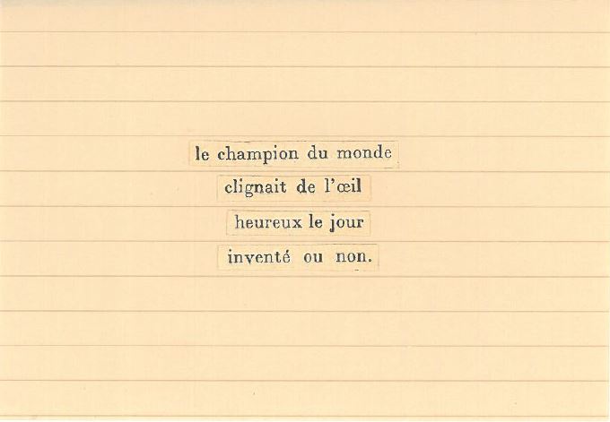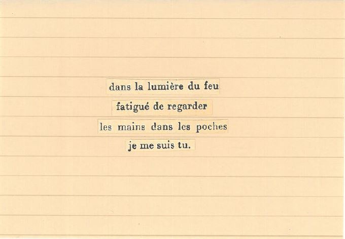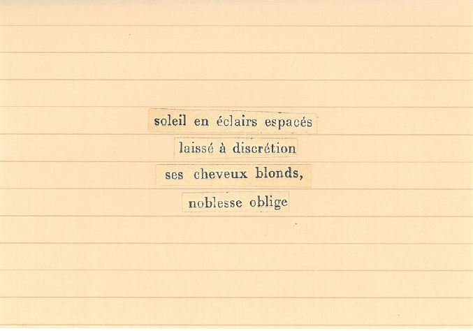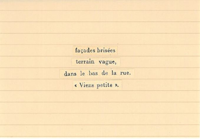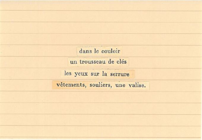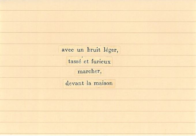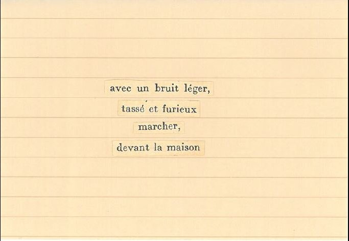 Ces courts poèmes offerts sous forme de petits livres reliés à Caroline pour son anniversaire le 1er janvier ont été découpés façon cut-up dans les pages d’un vieil exemplaire du livre de William Faulkner (traduction de Maurice Coindreau) : Le bruit et la fureur.