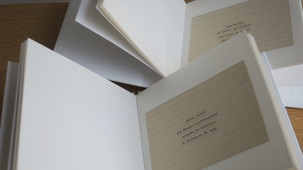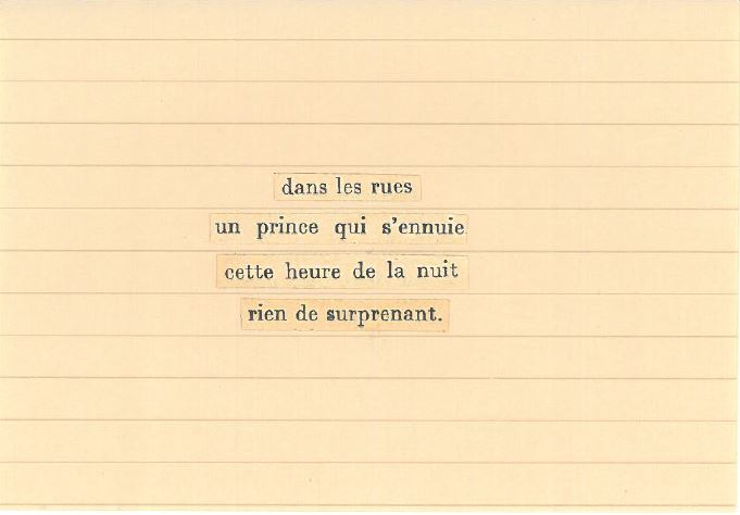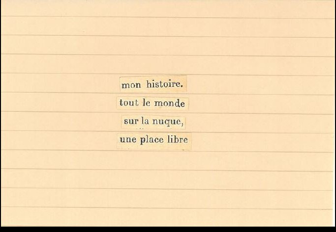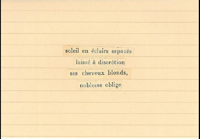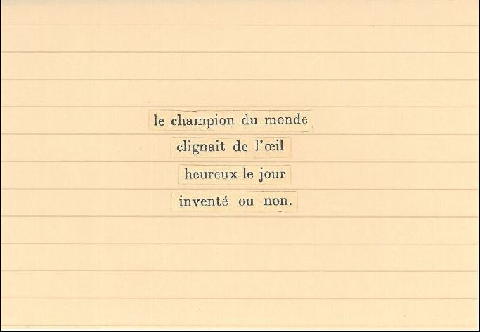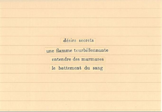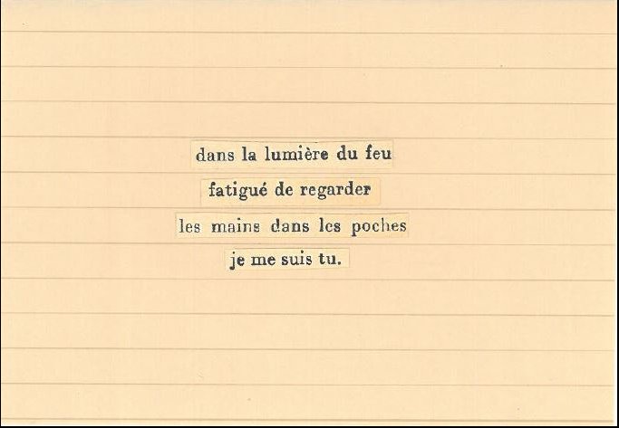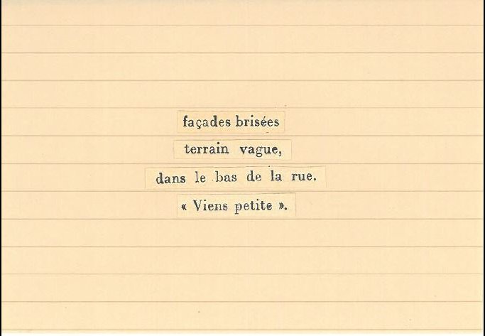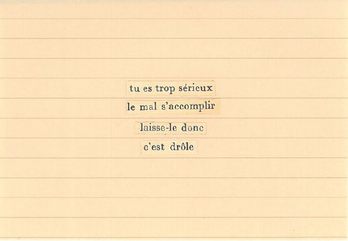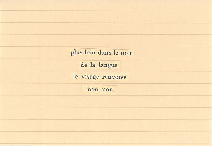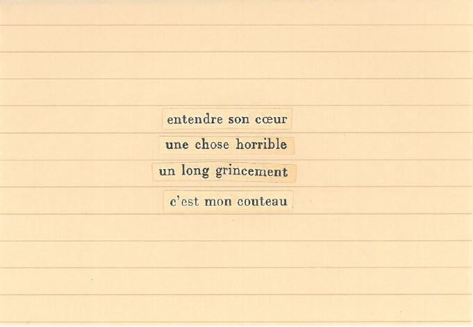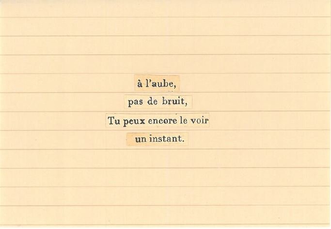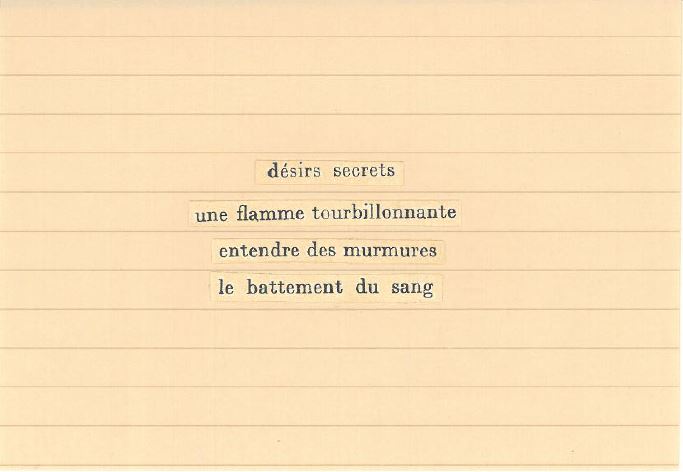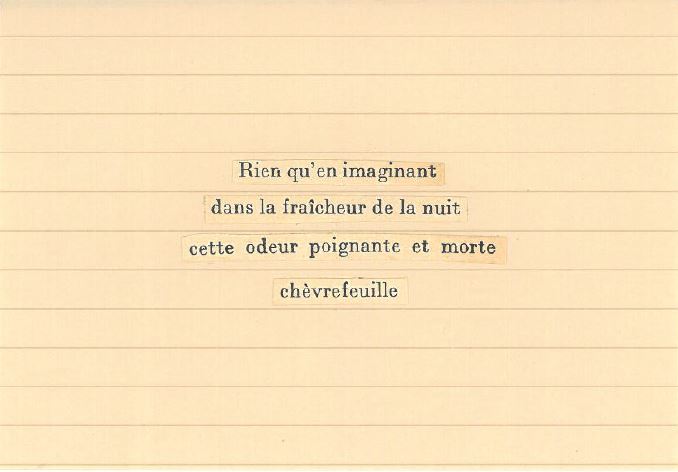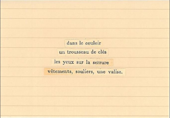 Ces courts poèmes offerts sous forme de petits livres reliés à Caroline pour son anniversaire le 1er janvier ont été découpés façon cut-up dans les pages d’un vieil exemplaire du livre de William Faulkner (traduction de Maurice Coindreau) : Le bruit et la fureur.