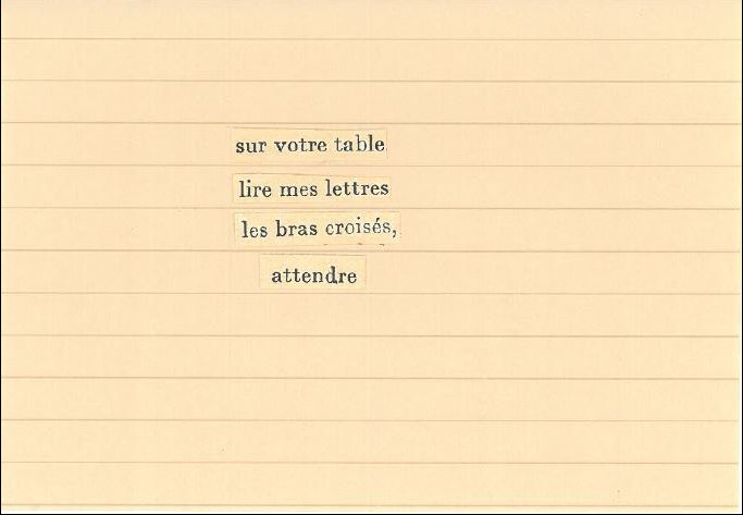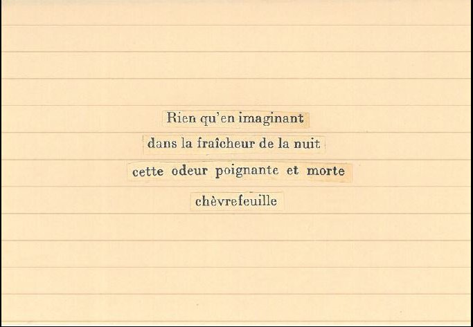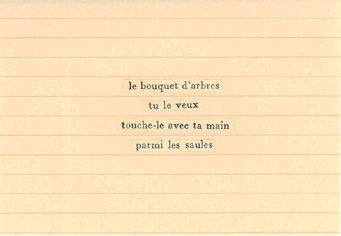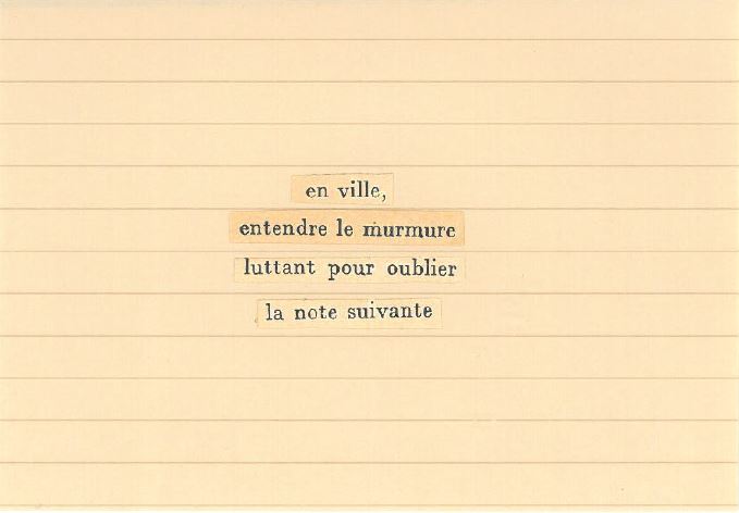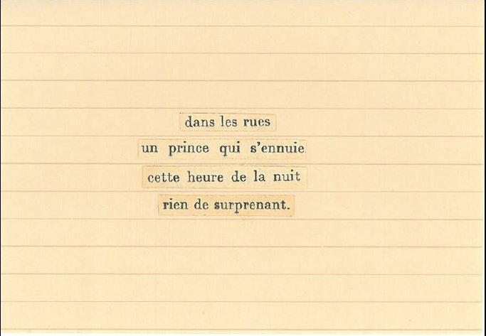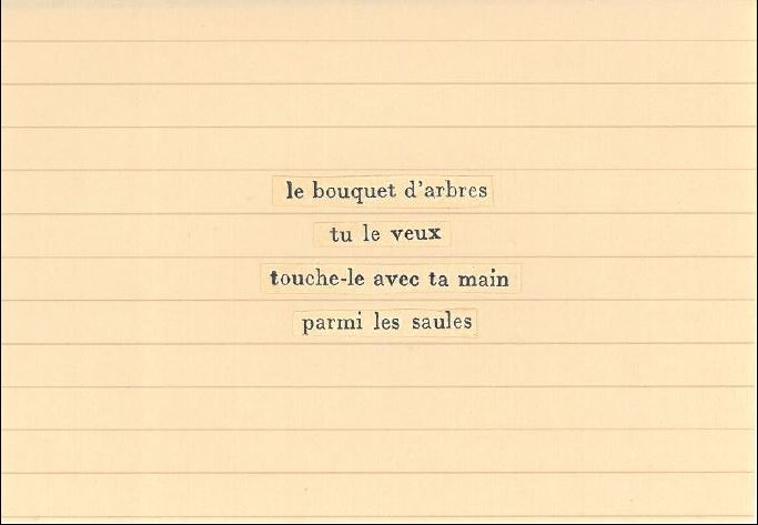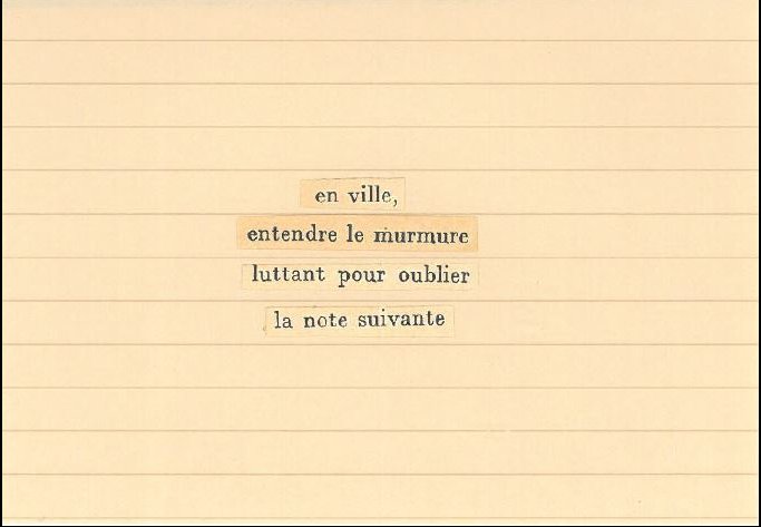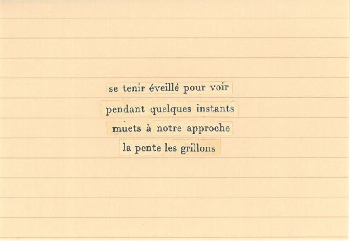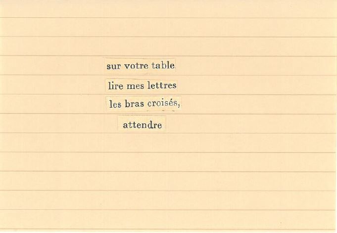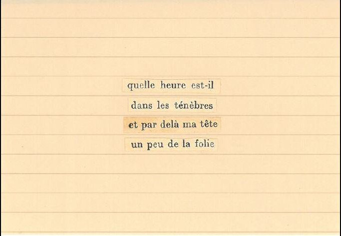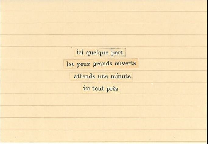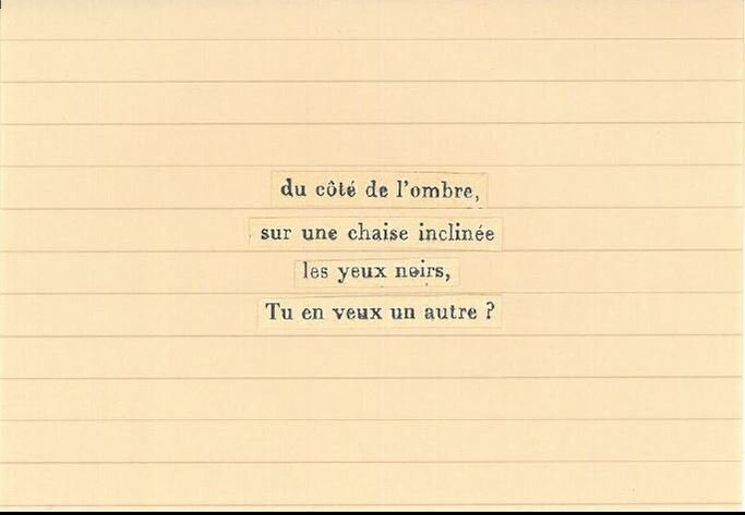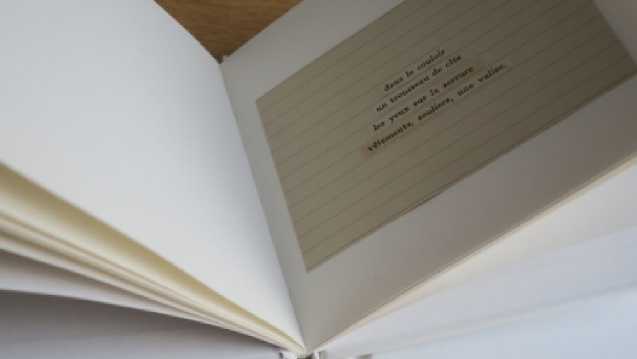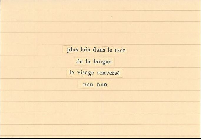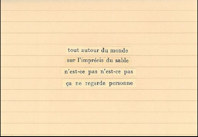 Ces courts poèmes offerts sous forme de petits livres reliés à Caroline pour son anniversaire le 1er janvier ont été découpés façon cut-up dans les pages d’un vieil exemplaire du livre de William Faulkner (traduction de Maurice Coindreau) : Le bruit et la fureur.