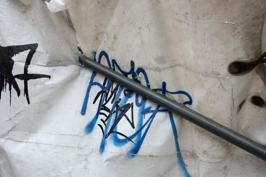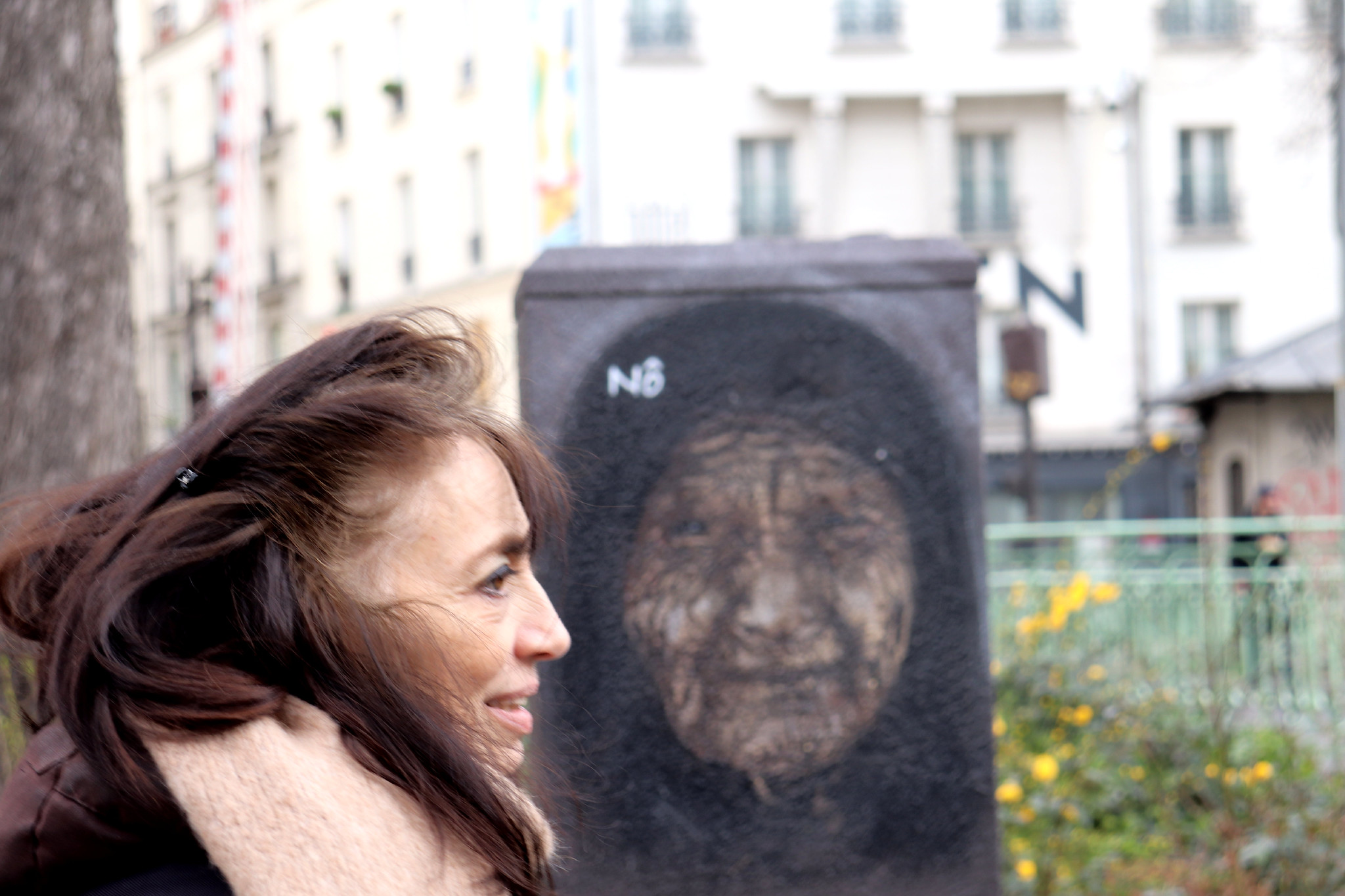 Reflets qui déforment les façades des immeubles, renversent les perspectives, modifiant jusqu’au vertige les dimensions et parfois même la matérialité. Les ombres de leurs silhouettes découpent à l’intérieur de leur vis-à-vis surexposé une trouée sombre qui les transperce. Dans la salle d’un restaurant prestigieux, dont c’est la journée de fermeture, la lumière s’infiltre à l’intérieur, à travers les rideaux pourtant tirés, laissant penser que la salle est animée alors qu’il n’y a aucun client, ni personne en service pour s’occuper d’eux. L’ombre translucide d’un lampadaire flotte sur le mur nu, à côté de son reflet sur la vitre attenante. Une femme à boléro rouge et veste de la même couleur est assise sur un banc, elle se penche pour attraper la lumière. Dans son mouvement, elle tourne le dos à la statue qui la surplombe en se penchant vers elle au risque de perdre l’équilibre. Un bâtiment en verre, installé depuis longtemps au centre de la place du Palais-Royal, se fait oublier avec le temps. Les immeubles alentour donnent l’impression qu’ils l’ont désormais accueilli parmi eux. Ils ne renvoient plus leur image en les diffractant, mais les intègrent généreusement aux siennes. Cela devient difficile de repérer où commence l’un et où l’autre finit. Une statue vue de profil, juchée sur son haut piédestal, ne nous voit pas l’observer regarder les passants en contrebas. Un mur au vent qui, malgré les bourrasques du jour, ne bouge pas quand on essaie d’en filmer le mouvement, seulement quand on éteint la caméra. Dans la vitrine d’un passage couvert, un mannequin dont les mensurations disproportionnées attirent le regard et troublent le désir.