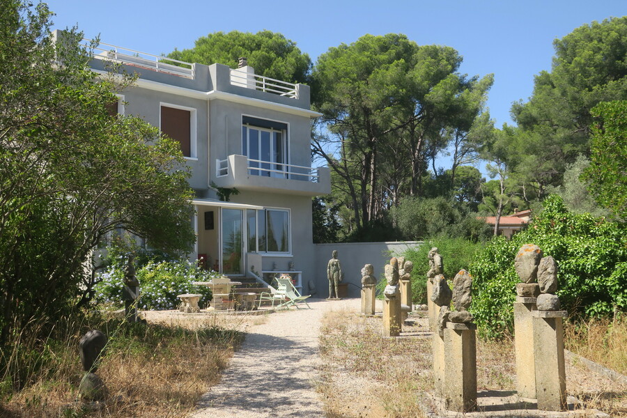 La Villa Deroze a été construite en 1948 sur un terrain isolé, découvert pendant l’occupation allemande de la Ciotat dans le quartier dit Pignet de Rohan. Gilbert Deroze, pharmacien, y construit en 1957 un laboratoire de produits pharmaceutiques, qui fonctionnera jusqu’en 1970. Passionné de peinture, de sculpture, de musique et d’architecture, il crée quand il trouve le temps. Une des pièces les plus étonnantes de sa villa, dont les murs sont recouverts de ses toiles tandis que le jardin est parsemé de sculptures et des œuvres d’autres artistes, est un peu secrète. Pour y accéder, plusieurs portes à pousser, plusieurs sas à franchir. Il s’agit de l’atelier de l’ancien propriétaire du lieu, Gilbert Deroze. La pièce est assez lumineuse, malgré l’absence de grandes fenêtres. Au centre, une très belle table en bois jonchée de papiers, de boites de couleurs, de pinceaux, de bouteilles d’encre de Chine, de vernis à peindre, d’acétone. Contre le pied de la table, un porte-carton dans lequel on trouve pêle-mêle des gravures anciennes, des esquisses de dessins, des peintures sur papiers de l’artiste. Sur le pan de mur à gauche, un large buffet à côté d’un établi, sur le dessus duquel traînent de vieux tableaux peints à l’huile, une photographie de l’artiste en jeune garçon, une pipe à la bouche, entouré de bustes dont on peut supposer qu’il s’agit de ses enfants. Plus incongru dans cet atelier, de grands circuits intégrés accolés aux murs tels des tableaux d’un autre temps. De l’autre côté de la pièce, les murs sont intégralement recouverts d’étagères en bois et parpaings où reposent des centaines de bustes, sculptures anthropomorphes, réalisées à partir de deux grosses pierres disposées l’une sur l’autre, choisies par l’artiste pour leur expressivité. Il trace les yeux, la bouche, parfois le nez, en creusant légèrement leurs contours dans la pierre brute. Sur le socle en bois de chaque œuvre, une plaque indique leur titre, noms de personnalités, types de personnes, de caractères ou d’émotions. La liste de ces figures forme une étrange galerie de portraits qui dessine en creux l’autoportrait de leur auteur.