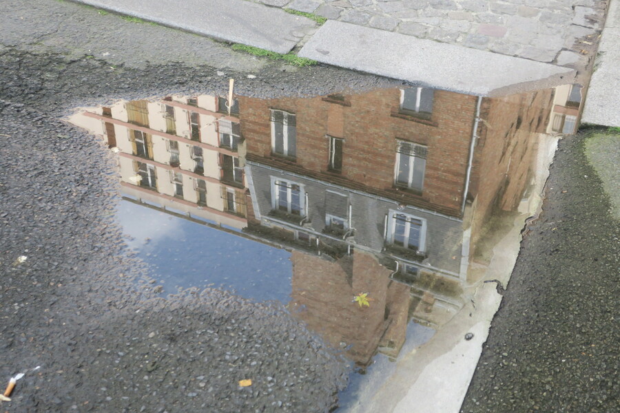On regarde, un peu absent, et ça se forme, doucement. Les nuages se réfléchissent de manière symétrique sur l’immense paroi vitrée. Un test de Rorschach, sans réponse nette, sans figure sûre. On passe, on ne sait pas ce qu’on a vu, juste que c’était là. Sous les pas, de larges pavés récemment posés. Réaménagement des abords, annonce la ville, et ce mot, PRIORITÉ, fragmenté, dans la pierre comme une injonction oubliée. À proximité, la lumière laiteuse à la surface immobile du canal, entre deux écluses, et, plus loin, le long du mur de soutènement, des lambeaux de papiers colorés flottent au vent, rien d’autre que les restes d’une fête passée. C’est là qu’on pense au tableau. Des années à le croiser, à regarder ce visage de femme aux yeux en amande, dont la peinture lentement disparaît, et puis un jour enfin, on le photographie. Au moment même où il s’efface. Plus loin encore, coups de tonnerre réguliers, mais pas l’ombre d’un nuage à l’horizon. Mettre du temps à comprendre : des explosions sourdes, persistantes d’un salon de l’aviation, avec le même temps retard que le décalage perçu entre l’éclair et son grondement. Il y a aussi cette coupole, les reflets des nuages pommelés dans le ciel bleu sur sa surface brillante, dôme ou œil, on ne sait plus. Puis soudain, le rire de Gracia dans le café de Valmy. Vif, présent, éclatant. La reconnaître à son rire, sans la voir. Et tout continue de passer. On n’apprend que bien plus tard qu’il s’agissait bien d’elle.