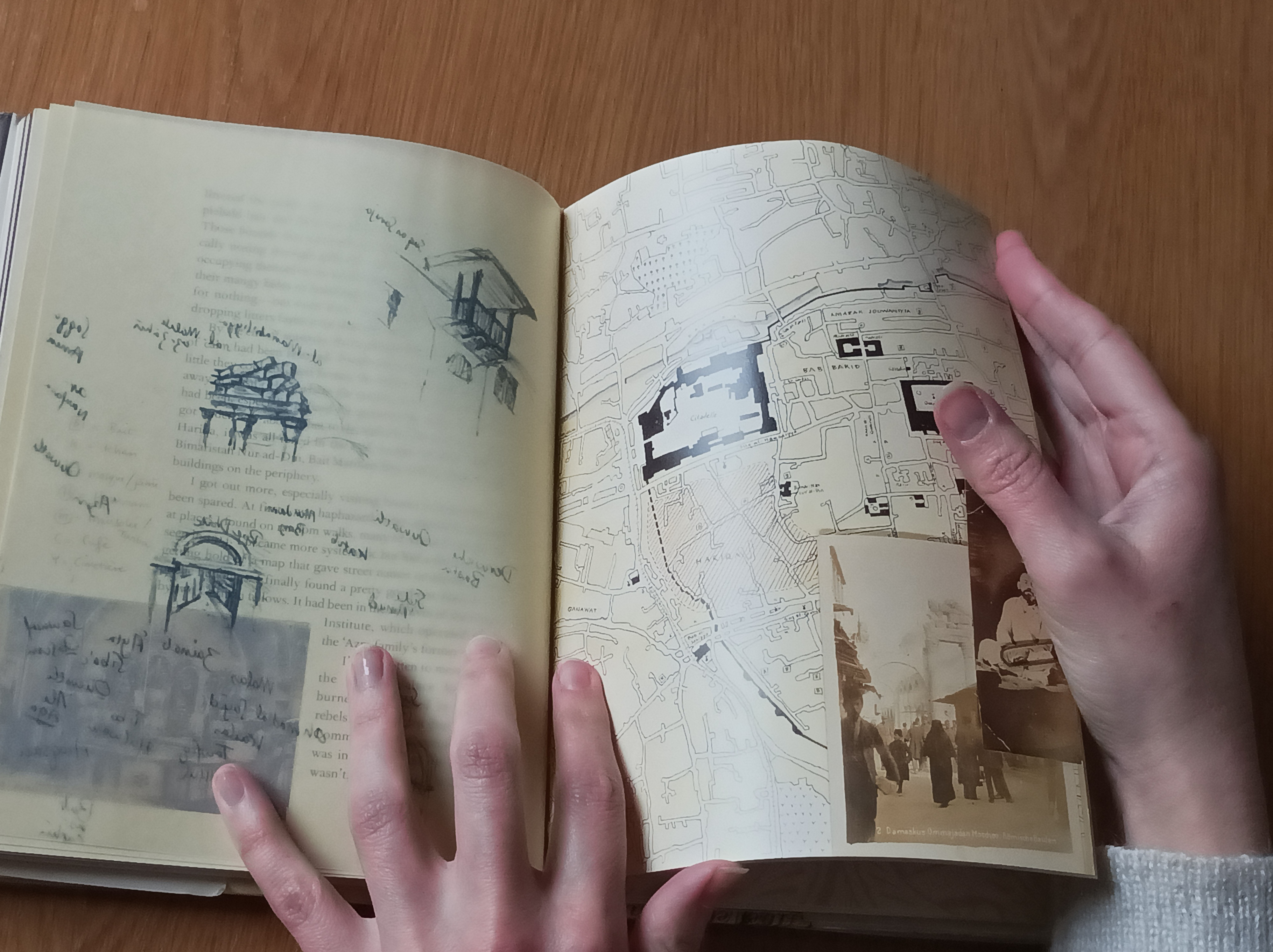 The Lives of Shadows de Barbara Hodgson mêle récit historique et dispositif visuel foisonnant pour explorer la mémoire d’une maison damascène et le poids du colonialisme. En superposant textes fragmentés et documents variés (photos, plans, fleurs séchées), l’ouvrage brouille les frontières entre fiction, archives et imaginaire. Le parcours de Julian et de l’ombre d’Asilah fait émerger une narration hantée, entre réalité et fantastique. Grâce à la matérialité du livre, chaque page sollicite activement le lecteur, qui manipule calques et images, prolongeant l’expérience sensorielle et politique. Cette mise en page transforme la lecture en voyage immersif au cœur des souvenirs dispersés. [30]