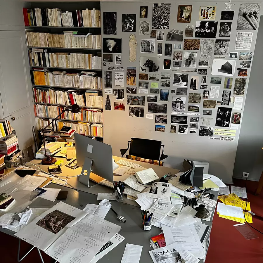Hélène Giannecchini, autrice et spécialiste de la photographie, compose pour chaque projet un vaste mur d’images qui accompagne son écriture. Pendant son séjour à la Villa Médicis, elle a rassemblé gravures anatomiques, photos anciennes et cartes postales, explorant visuellement le deuil et la mort pour son roman Voir de ses propres yeux. Ce dispositif évolutif, accroché face à son bureau, agit comme une extension de sa pensée et nourrit le texte sans l’illustrer directement. Les images deviennent un outil de réflexion et de mémoire, une manière d’apprivoiser l’indicible. Une fois l’écriture achevée, ces images rejoignent ses archives comme traces de la genèse littéraire. [7]