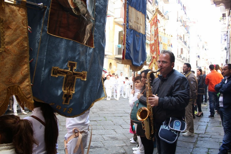 Les jours de fêtes religieuses, des processions ont lieu dans chaque paroisse. Provenant d’une des ruelles adjacentes de la Via dei Tribunali, le son d’un orchestre nous parvient lointain. Nous nous en approchons tout en continuant à chercher notre chemin. Mais la musique nous attire irrésistiblement.