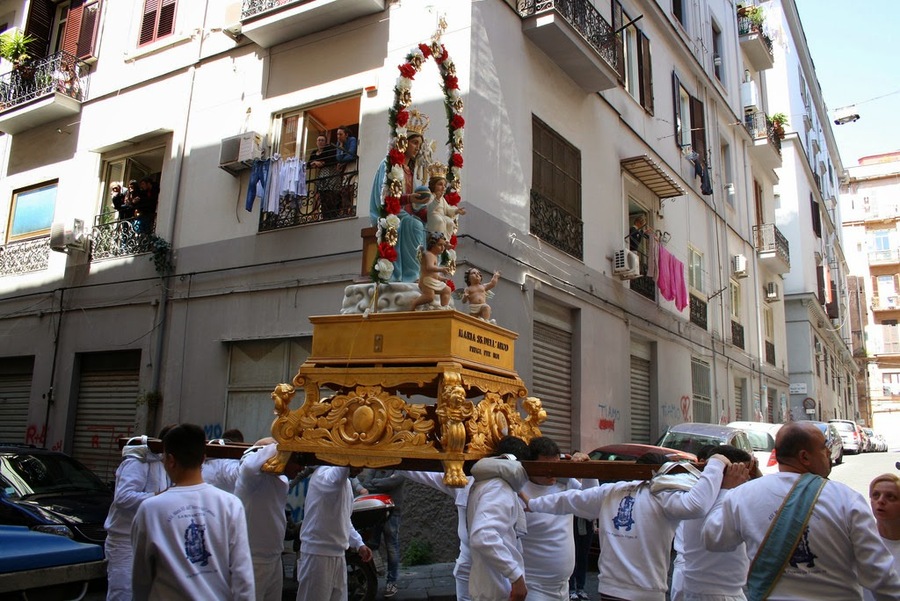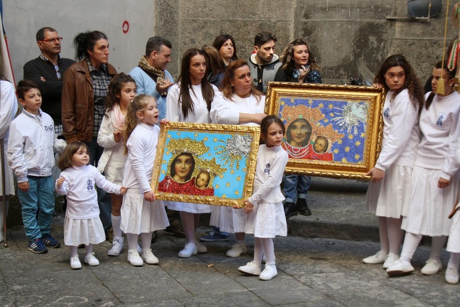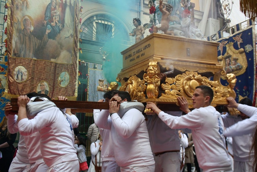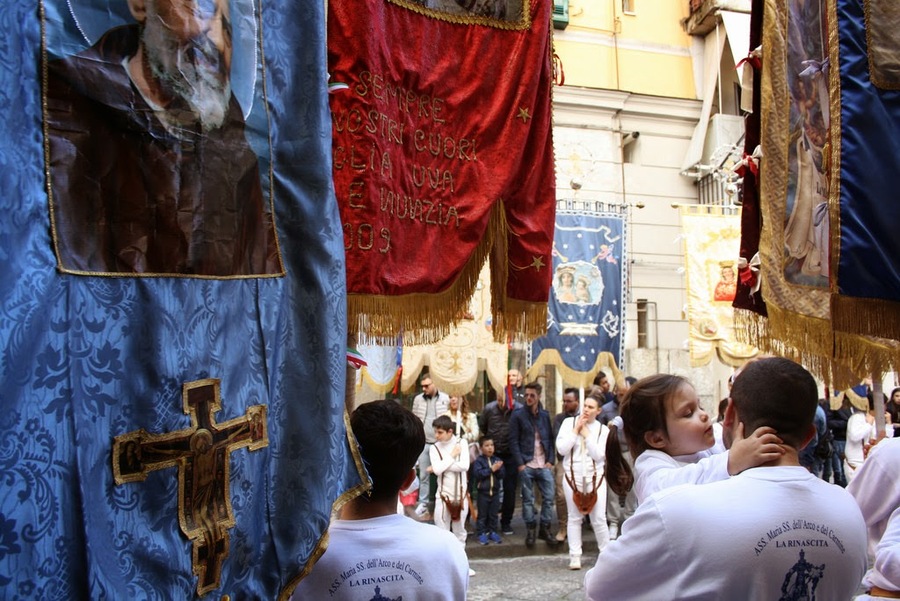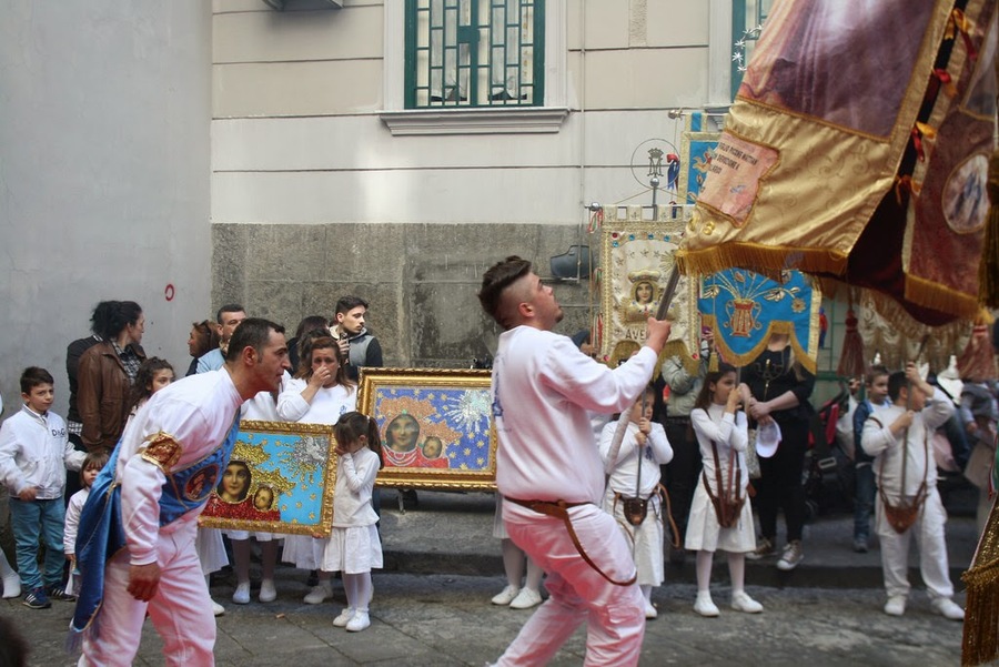 À chaque oratoire, c’est le même cérémonial de la procession de la Madonne dell’Arco, les croyants rejoignent à pied le sanctuaire de la Madonna dell’Arco situé à Sant’Anastasia, afin de commémorer le miracle apparu en 1450 en ce même lieu : « Lors de la fête qui se déroulait chaque année en l’honneur de la Vierge, les habitants organisaient un jeu de balle qui consistait à envoyer la balle le plus loin possible avec un manche en bois. Un jour, un des perdants fou de rage, prit la balle et la lança en direction de l’édicule consacré à Marie. La balle percuta la joue gauche de la peinture de la Vierge, qui se mit aussitôt à devenir rouge et à saigner, entraînant un cri d’effroi dans l’assemblée. »