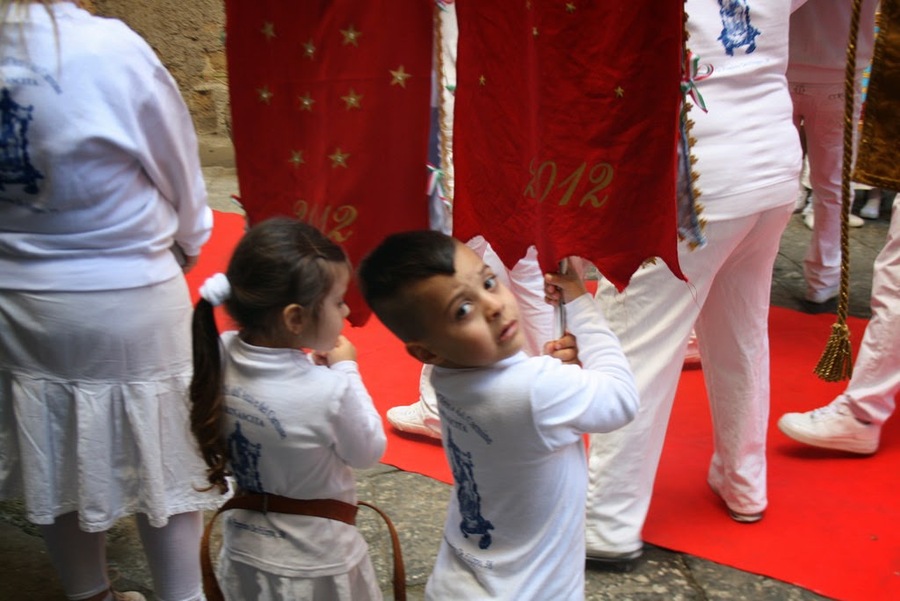 Les plus petits en tête avec leur drapeau, chacun vient incliner sa bannière devant l’autel fleuri, sous la houlette d’adjudant qui n’hésite pas à imprimer une ferme poussée sur les épaules des enfants afin que la génuflexion soit plus de fervente. Le porte oriflamme avance les jambes pliées en faisant osciller sa bannière, l’inclinant parfois devant une maison ou un immeuble pour les bénir. Puis vient le dais que l’on fait aussi osciller au son d’une musique répétitive (cuivres et tambours). Il paraît bien lourd à en juger par l’état de fatigue des porteurs au physiques très disparates. Ensuite c’est le salut au Saint dans un embrasement de fumée rouge et verte, sur une marche entonnée au saxophone qui hésite entre fanfare et parade. Et la procession recommence ensuite le même chemin en sens inverse, comme un film à l’envers, pour se remettre dans le bon ordre avant de partir vers l’oratoire suivant.