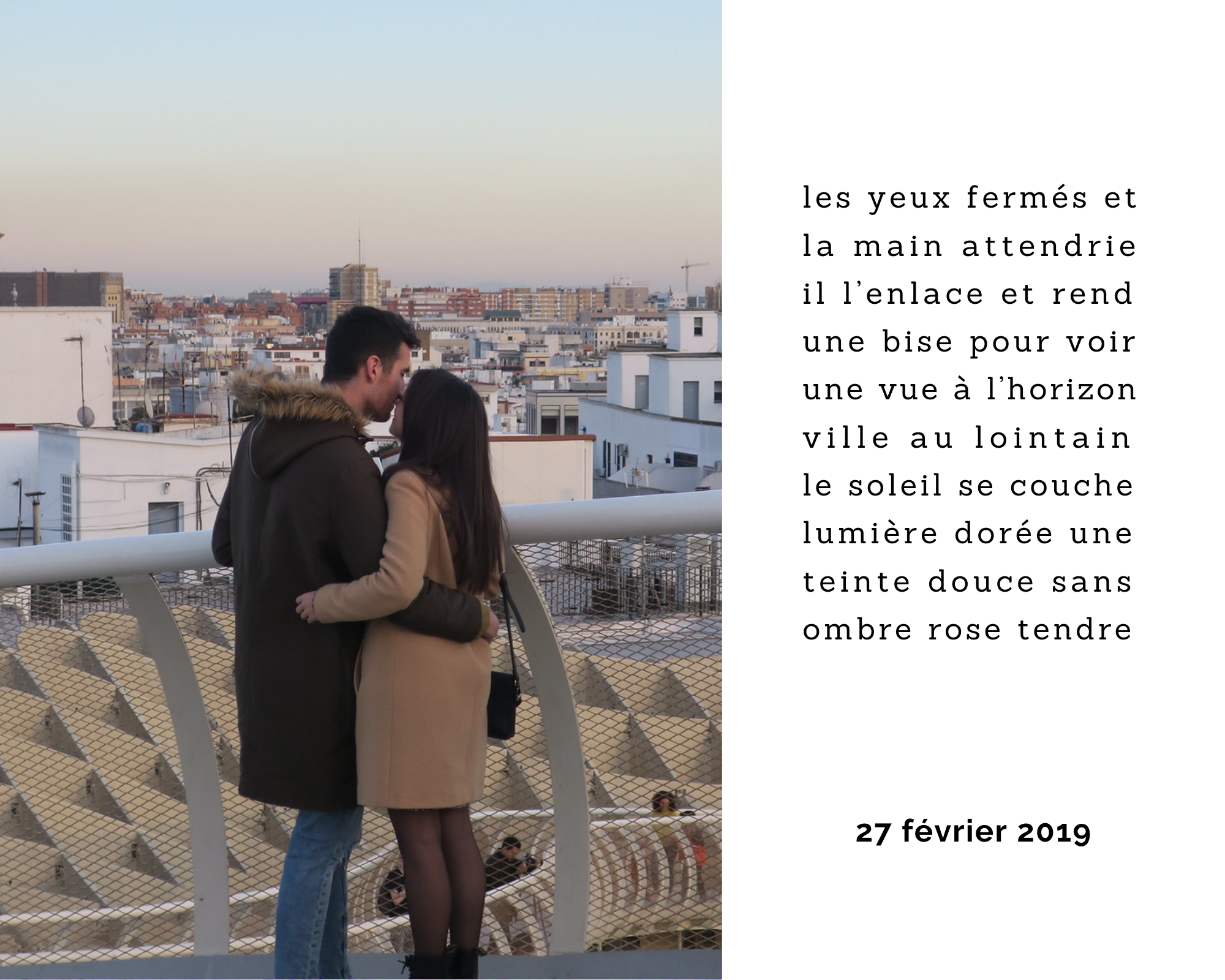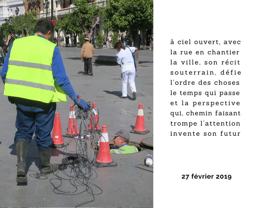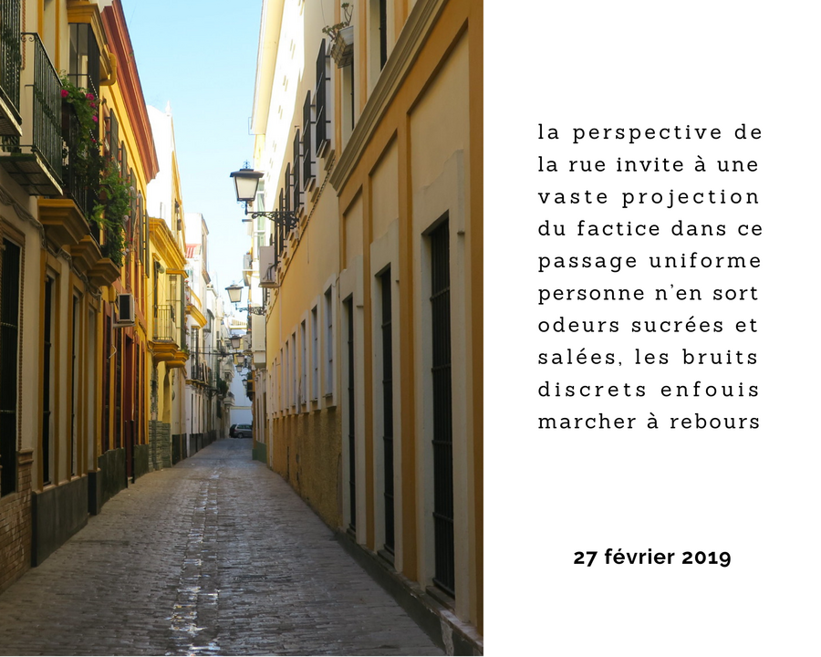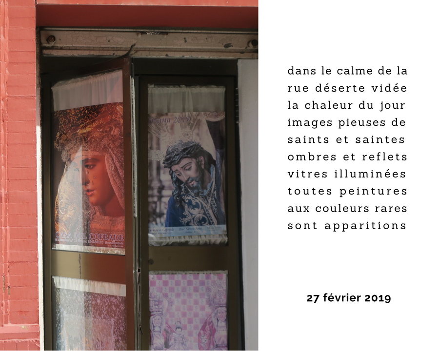 Textes écrits à partir de photographies prises à Séville en février 2019, d’après le principe d’écriture du texte de Michèle Métail, La Ville, de la ville : Décrire une scène urbaine sous la forme d’instantanés poétiques en 10 lignes de 15 lettres, dimensions respectant celles d’une photo (10×15cm).