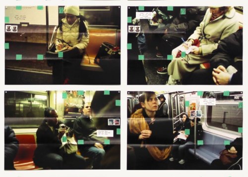 Dans son exposition Life without sheets of paper to be scribbled on is masterpiece (la vie sans feuilles de papiers destinées à être griffonnées est un chef d’œuvre) qui se termine le 29 juin au Camden Arts Center de Londres, il y a une étonnante série de photographies de gens écrivant dans le métro de New York.