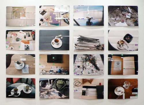 La tasse à café et sa soucoupe, objet de méditation de Jean-Luc Godard dans Deux où trois choses que je sais d’elle, l’environnement du café, les objets accumulés, la carte et les papiers griffonnés sur les sépultures des cimetières parisiens jonchés de souvenirs personnels et de ticket de métro, témoignent précisément d’un lieu émotionnel, fusionnant espace domestique et espace d’exposition, lieu de repos et lieu de de prose, d’accueil et de recueillement, avec ce qui arrive et ce qui est déjà passé.